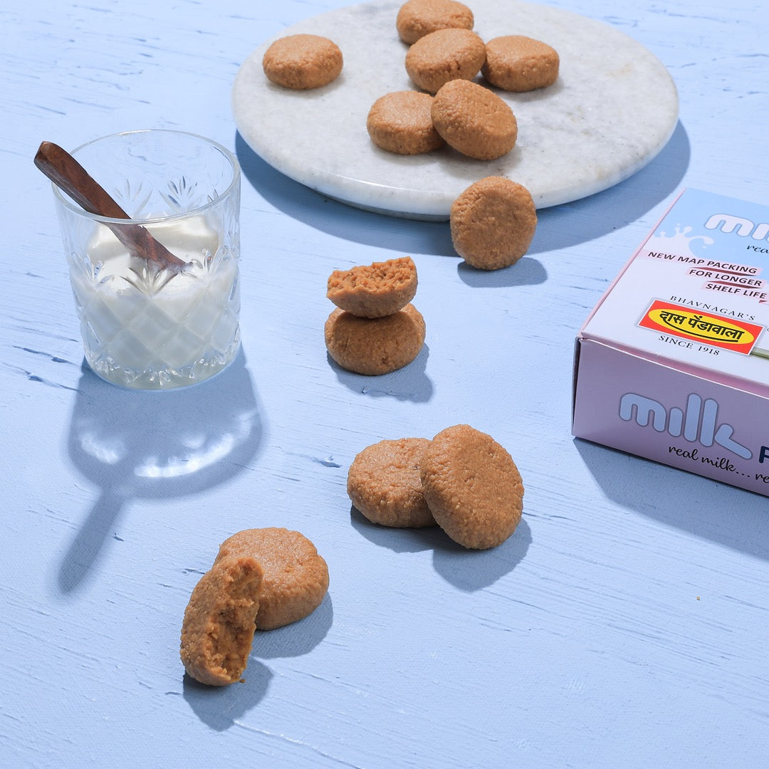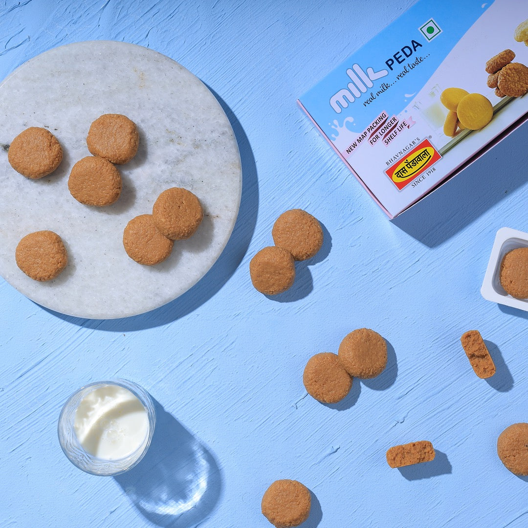 Thabdi Peda stands out with khoa cooked until rich red, boasting a deep, caramelized flavor that’s robust and resonant. A touch of warmth reveals its full flavor range, making it a distinctive choice for those who appreciate richer, more textured sweets.